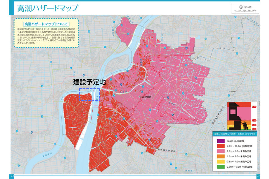 実際、福岡県の高潮ハザードマップ上では、5m~10mの浸水が想定されるエリアに指定されています。