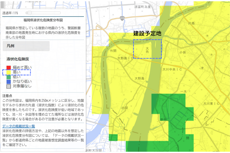 この画像は国土地理院の「福岡県液状化危険度分布図」からの引用です。